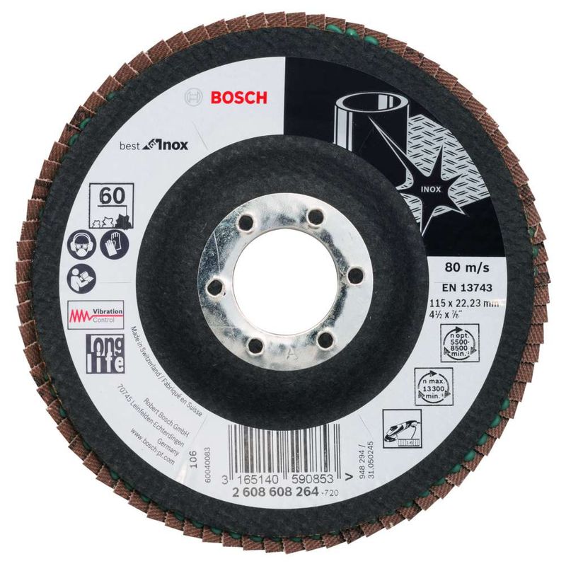 | Inclui | 1 peça de Disco Flap X581 Best for Inox; 115mm G60; Curvo; Fibra de Vidrio |