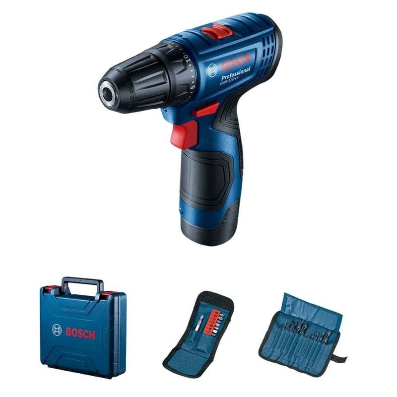| Inclui | 1 Furadeira / Parafusadeira GSR 120-LI, 1 manual de instruções para GSR 120-LI, 1 manual de instruções para carregador GAL 12V-20, 1 carregador rápido GAL 12V-20, 2 baterias 12V Max de 2,0 Ah Li-Ion, Kit com 21 acessórios (4 brocas madeira + 6 brocas metal + 10 bits + 1 extensor) |